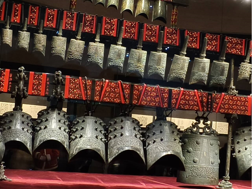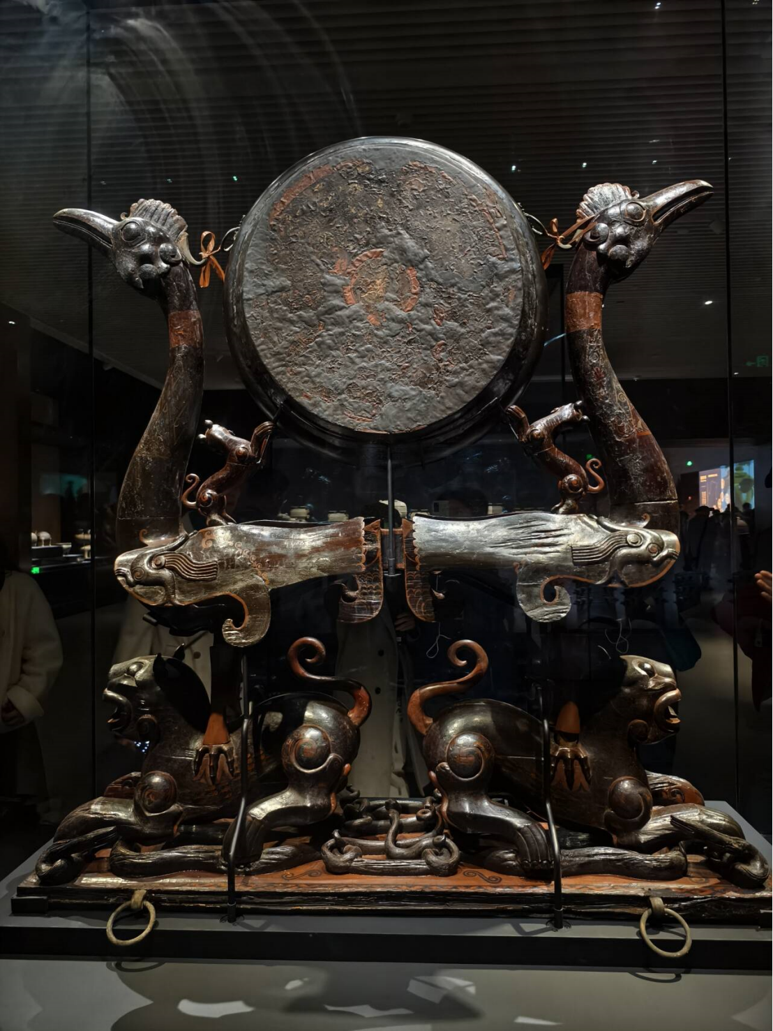 一踏入博物馆的大门,同学们就被那庄严肃穆的氛围深深吸引。踏入馆内,曾侯乙编钟恰似从历史烟霭中走来,其青铜铸就的身躯,满刻岁月的铭文,似在低诉先秦雅乐盛景。“八音克谐,无相夺伦,神人以和。”当想象那编钟齐鸣,礼序昭然、和乐融融之景浮现眼前,彰显古人对天地秩序、人文伦理尊崇,和谐有序、礼乐相彰正是精神文明的古朴注脚。它们整齐排列,仿佛正等待着我们的聆听。随着讲解员的介绍,同学们仿佛穿越回了两千多年前的战国时代,感受到了那个时代音乐文化的繁荣与辉煌。编钟的悠扬旋律,不仅展示了古代音乐艺术的高度成就,更让大家体会到了古人对美的追求和对和谐社会的向往。