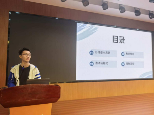 随后,24级团总支书记蒋佳桐带来了《如何办好一场活动》的经验培训。他为大家介绍了开展活动的基本思路以及组织活动的基本流程,其中包括如何借用教室、如何发布邀请函等一系关于开展活动的具体内容与细节,这也正对应了许多新生班级在开展工作中存在的“疑难杂症”。经过他细致的分享讲解,同学们都收获颇丰,大家都表示在活动策划方面理清了思路,收获了宝贵的工作经验。