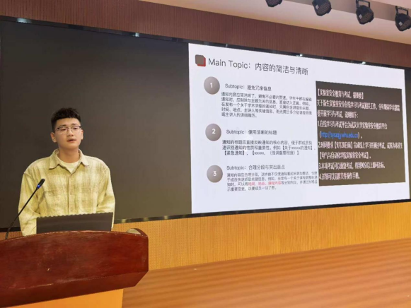 24级团总支组织部部长何俊良进行了《如何编好一则通知》的经验分享。他首先强调了一个好的通知在活动中的重要作用,其不仅能够帮助同学们理解活动主旨,更能有效快速地开展相关工作。接着,何俊良同学从通知的编辑与优化、发布通知的相关经验、通知后续的跟进与总结等几个方面逐一展开,讲述过程用以往工作中的实际通知作为范例进一步详细分析,同学们都深有感触。