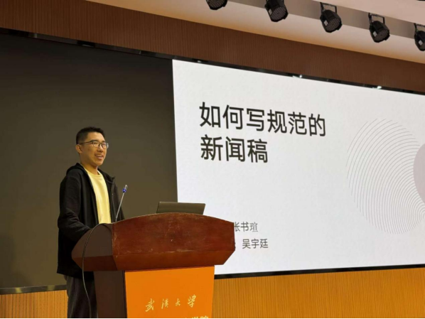 接下来,24级学生会秘书长吴宇廷为大家带来了《如何撰写合格的新闻稿》的主题分享。吴宇廷同学主要从注意学习过往经验、基本规范、文字工作三个方面出发,为大家着重讲解了“下笔写什么”、“怎么规范写”的具体问题,帮助大家打好文字基础,为撰写优质的新闻稿积累经验。