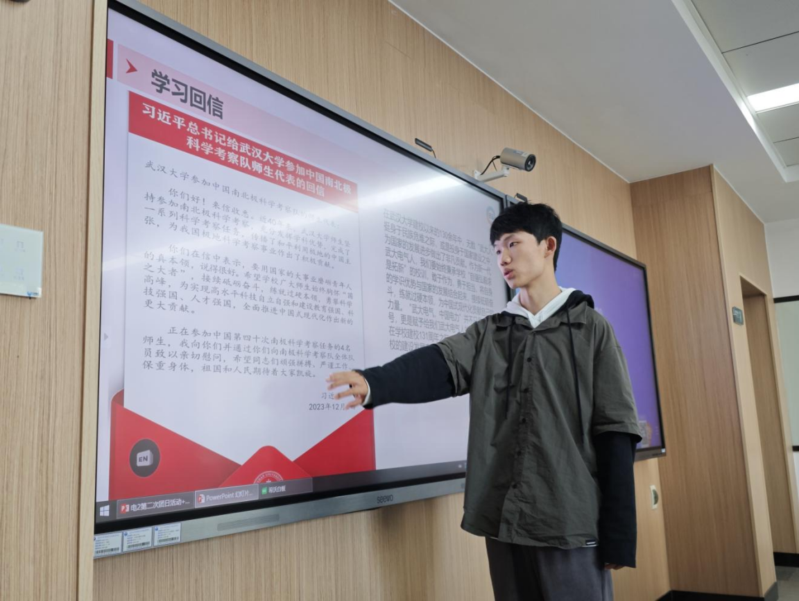会议第三项,进入关键的学习环节。同学们全神贯注地学习习近平总书记给武大的回信,深刻领会其中蕴含的精神内涵。大家一致表示,习近平总书记的回信是对武大学子的殷切期望与极大鼓舞,必将激励着他们在学习和生活中持续努力,为实现中华民族伟大复兴的中国梦贡献自身的力量。