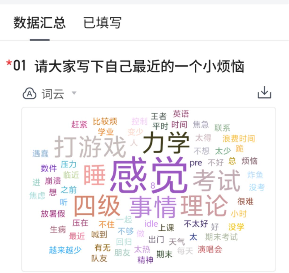 班会主要开展了一个匿名小游戏,理论力学考试刚刚结束,同学们心中压力刚刚释放。借着团建的机会,引导同学们说出最近内心的压力和烦恼。在“心灵盲盒”中,同学们在匿名表格中写下自己近期的烦恼,上传到象征包容和理解的“烦恼聚集地”。当这些承载着困惑和压力的文字被悉数揭开,同学们心中流淌着温暖的回应,如同暗夜星火,照亮彼此的心灵角落。
