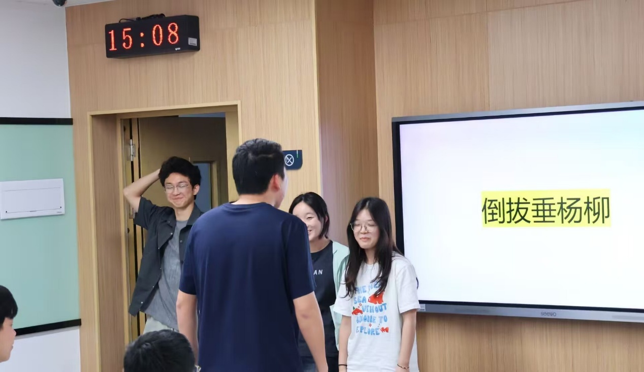 在紧张刺激又趣味横生的游戏环节中,全班同学首先随机分为五组。数字炸弹游戏迅速点燃现场氛围,大家屏息猜数、笑声不断,“幸运中奖者”则需接受“糖果惩罚”;你比划我猜环节考验信息传递能力与团队默契,各组选手手舞足蹈传线索、聚精会神猜词汇;故事接龙游戏将团队协作推向高潮,同学们需发挥创造力与逻辑思维,共同编织主题鲜明、情节连贯的故事。