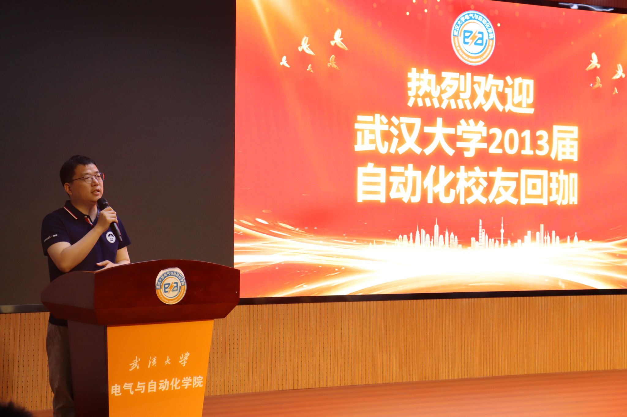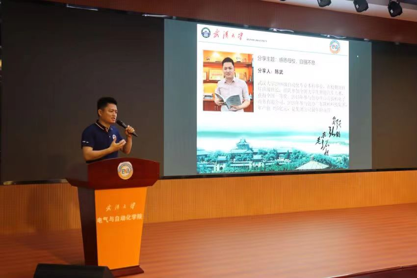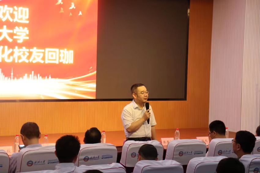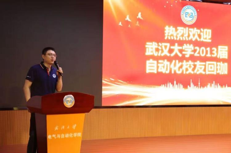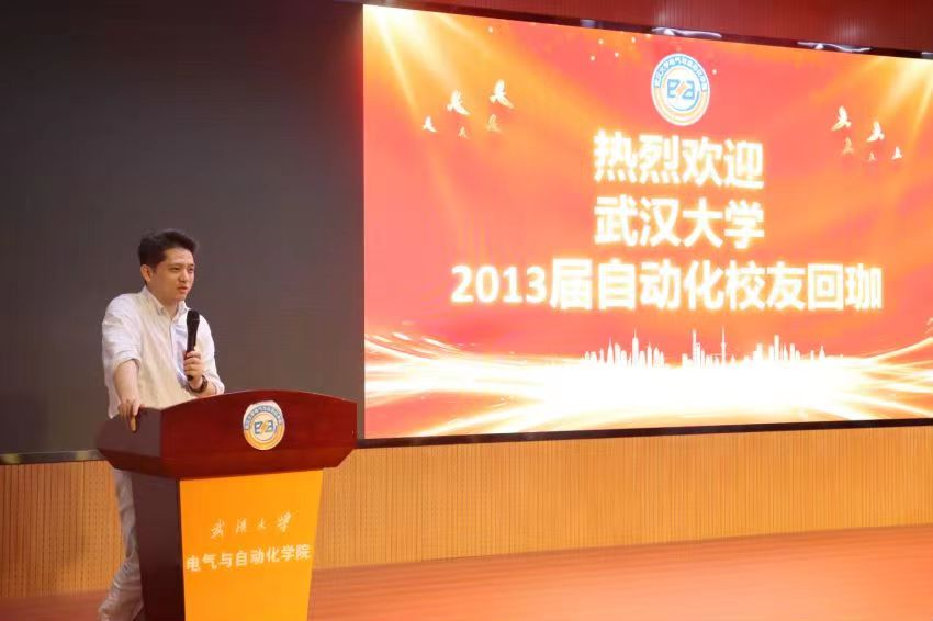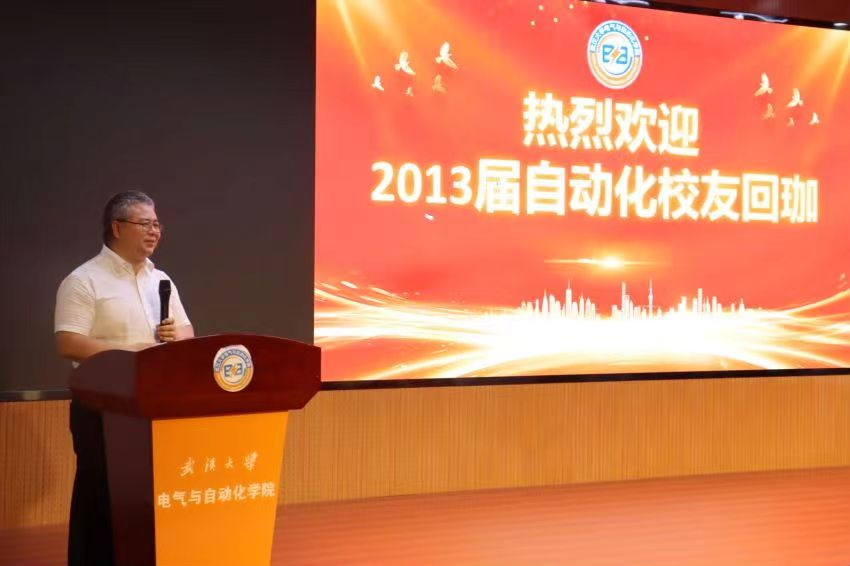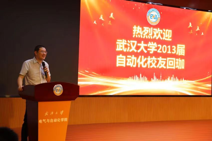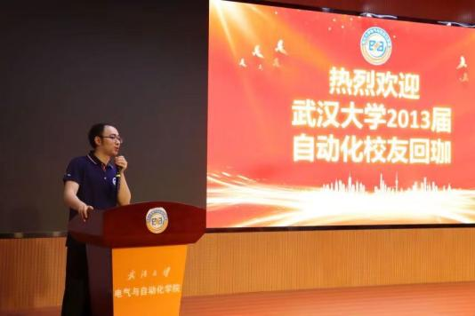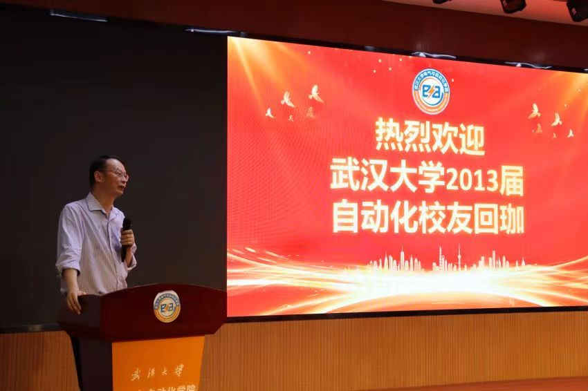 自动化系主任丁李教授代表自动化系致辞。今年恰也是丁李教授毕业二十周年,今天回校的许多校友也是由他带领完成毕业设计。他介绍了自动化系近几年的变化:六年内,自动化系几经搬迁,发展欣欣向荣。自动化系引以为傲的智能汽车竞赛一直保持着优秀传统,在全国一等奖的数量上名列第一。他对优秀的校友不吝赞美,表示从他们身上看到了武大自动化人的优秀品质。最后,他希望在校师生和毕业校友共同努力,为自动化系的发展贡献力量。